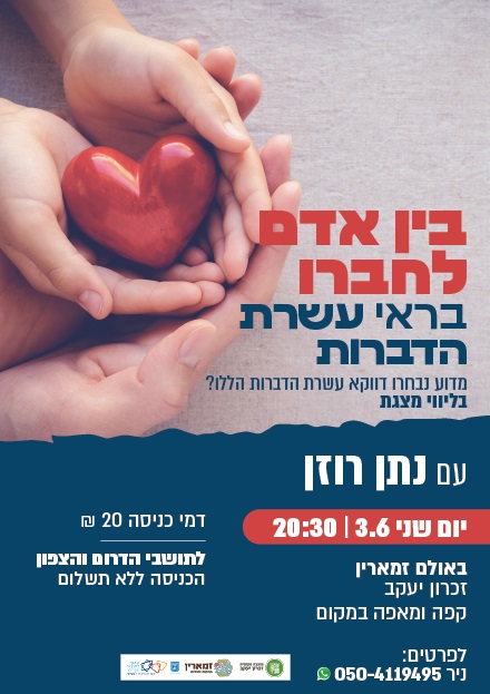 בין אדם לחברו בראי עשרת הדברות מדוע נבחרו דווקא עשרת הדברות הללו בליווי מצגת עם נתן רוזן יום שני 3.6.24 שעה 20:30 האירוע יתקיים באולם זמארין זכרון יעקב מחיר : 20 ₪ כולל קפה ומאפה בברכה ניר קובי 050-4119495 · הכניסה לתושבי הצפון והדרום ללא תשלום