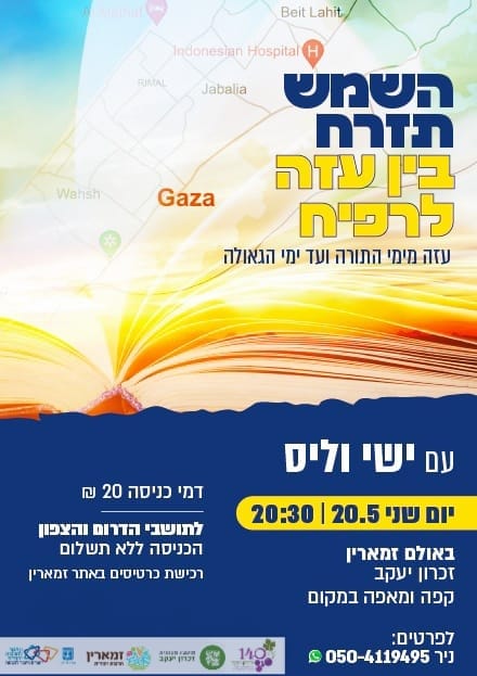 השמש תזרח בין עזה לרפיחעזה מימי התורה ועד ימי הגאולהעם ישי וליסיום שני 20.5.24שעה 20:30האירוע יתקיים באולם זמארין זכרון יעקבכניסה 20 ₪לרכישת כרטיסים באתר זמארין https://did.li/AU15qניר קובי 050-4119495כניסה חופשית לתושבי הדרום והצפון