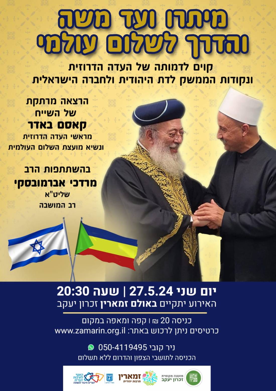 מיתרו ועד משה והדרך לשלום עולמיקוים לדמותה של העדה הדרוזיתונקודות הממשק לדת היהודית ולחברה הישראליתהרצאה מרתקת של השייח קאסם באדרמראשי העדה הדרוזית ונשיא מועצת השלום העולמיתבהשתתפות הרב מרדכי אברמובסקי שליט"א רב המושבהיום שני 27.5.24שעה 20:30האירוע יתקיים באולם זמארין זכרון יעקבכניסה 20 ₪קפה ומאפה במקוםניתן לרכוש כרטיסים באתר זמארין http://www.zamarin.org.ilניר קובי 050-4119495 ** לידיעה- הרשל"צ הרב … המשך קריאת הפוסט מיתרו ועד משה והדרך לשלום עולמי