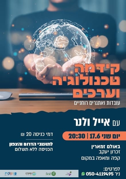 המימד הרוחני של ההתפתחות הטכנולוגית והכלכלית של ישראלעם אייל ולנריום שני 17.6.24שעה 20:30האירוע יתקיים באולם זמארין זכרון יעקבמחיר : 20 ₪כולל קפה ומאפהבברכהניר קובי 050-4119495 הכניסה לתושבי הצפון והדרום ללא תשלום