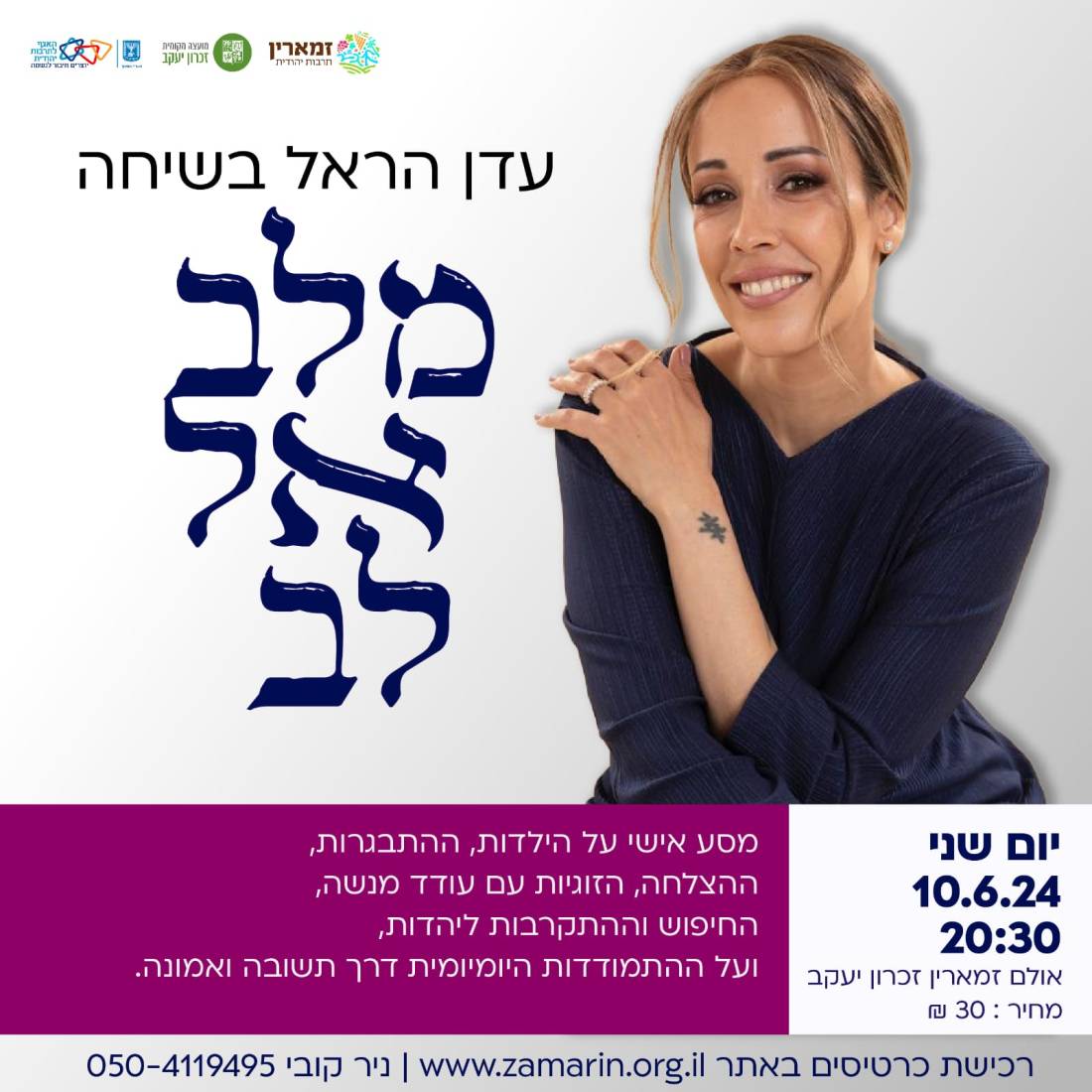 עדן הראל בשיחה מלב אל לבמהילדות בפנימייה דרך ההצלחה ב – M.T.V.דרך הנזירות בהודו החתונה עם עודד מנשה והחזרה בתשובההאמונה שתמיד הייתה ועכשיו עוד יותר מתמיד.יום שני 10.6.24שעה 20:30האירוע יתקיים באולם זמארין זכרון יעקבמחיר : 30 ₪לרכישת כרטיסים באתר זמארין http://www.zamarin.org.ilניר קובי 050-4119495