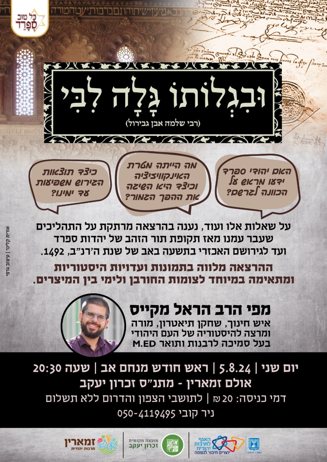 וּבִגָלוּתוֹ גָּלָה לִבִּי(רבי שלמה אבן גבירול )האם יהודי ספרד ידעו מראש על הכוונה לגלותם?מה הייתה מטרת האינקוויזיציה וכיצד היא הסיקה את ההפך הגמור?כיצד תוצאות הגירוש משפיעות עד ימינו?על שאלות אלו ועוד נענה בהרצאה מרתקת על תהליכים שעבר עמנו מאז תקופת תור הזהבשל יהדות ספרד ועד לגירושם האכזרי בתשעה באב של שנת הרנ"ב 1492.עם הראל מקייס … המשך קריאת הפוסט וּבִגָלוּתוֹ גָּלָה לִבִּי – האם יהודי ספרד ידעו מראש על הכוונה לגלותם?