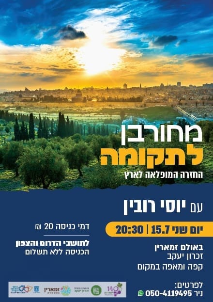 מחורבן לתקומההחזרה המופלאה לארץעם יוסי רוביןיום שני 15.7.24שעה 20:30האירוע יתקיים באולם זמארין זכרון יעקבמחיר : 20 ₪כולל קפה ומאפהבברכהניר קובי 050-4119495 הכניסה לתושבי הצפון והדרום ללא תשלום