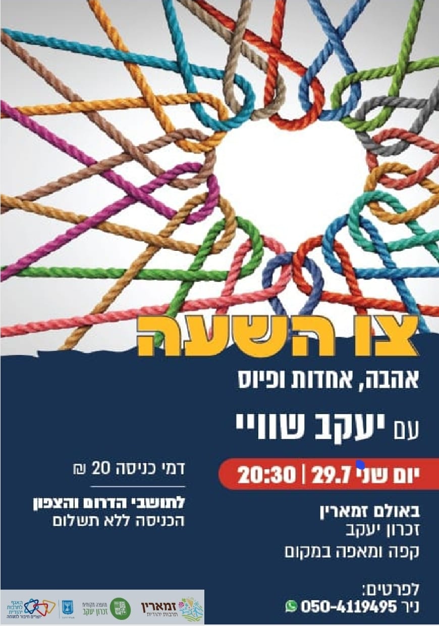 צו השעהאהבה אחדות פיוסעם יעקב שווייום שני 29.7.24שעה 20:30האירוע יתקיים באולם זמארין זכרון יעקבמחיר : 20 ₪כולל קפה ומאפהבברכהניר קובי 050-4119495 הכניסה לתושבי הצפון והדרום ללא תשלום