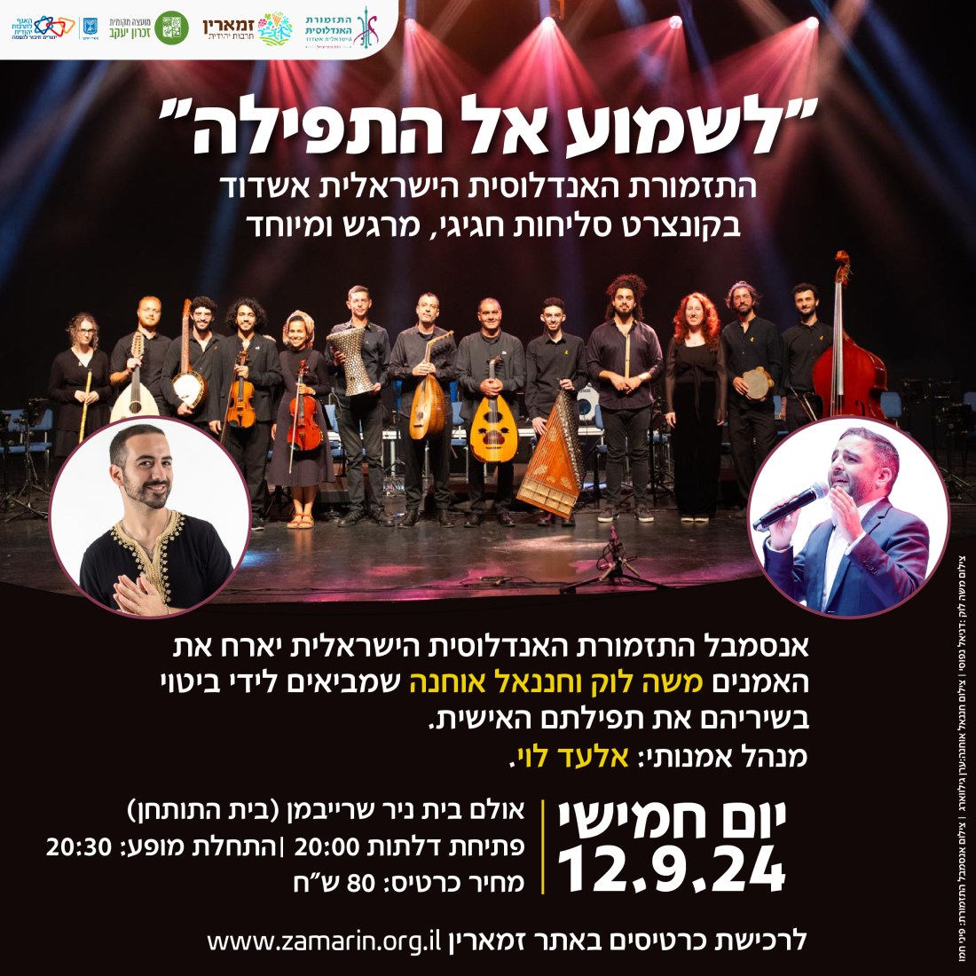 בקונצרט "לשמוע אל התפילה קונצרט סליחות חגיגי ברוח החיבור של כל אדם ואדם לקול הפנימי שנושא תפילה אישית ולקול שמשתתף בתפילת הקהל. פיוטי הסליחות הפכו לטקסטים מכוננים בתרבות היהודית, פגשו עם השנים את היצירות האישיות של אמנים רבים המבטאות את רוח הסליחות וההתבוננות הפנימית. בקונצרט, אנסמבל התזמורת האנדלוסית הישראלית יארח את האמנים *משה לוק* *וחננאל … המשך קריאת הפוסט אנסמבל התזמורת האנדלוסית הישראלית אשדוד