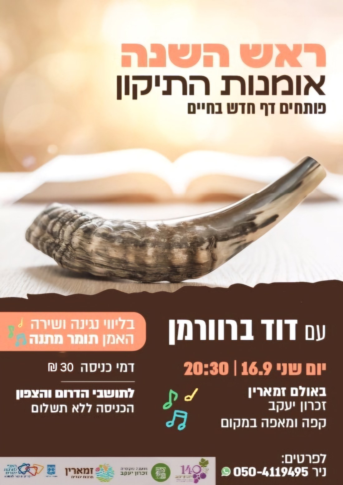 ראש השנה –אומנות התיקון פותחים דף חדש בחייםעם דוד ברוורמןילווה בנגינה ושירה האמן תומר מתנהיום שני 16.9.24שעה 20:30האירוע יתקיים באולם זמארין זכרון יעקבכניסה 30 ₪כולל קפה ומאפהניר קובי 050-4119495 הכניסה לתושבי הצפון והדרום ללא תשלום