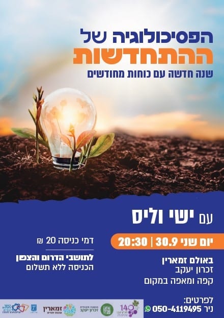הפסיכולוגיה של ההתחדשות –שנה חדשה עם כוחות מחודשיםעם ישי וליסיום שני 30.9.24שעה 20:30אולם זמארין זכרון יעקבמחיר : 20 ₪כולל קפה ומאפהניר קובי 050-4119495 הכניסה לתושבי הצפון והדרום ללא תשלום