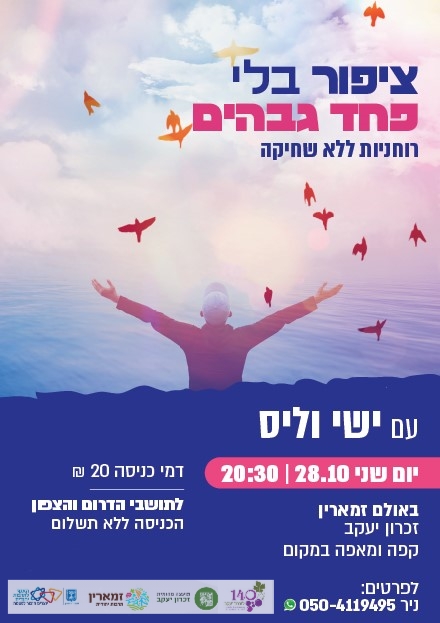 ציפור בלי פחד גבהיםרוחניות ללא שחיקהעם ישי וליסיום שני 28.10.24שעה 20:30אולם זמארין זכרון יעקבמחיר : 20 ₪כולל קפה ומאפהניר קובי 050-4119495 הכניסה לתושבי הצפון והדרום ללא תשלום