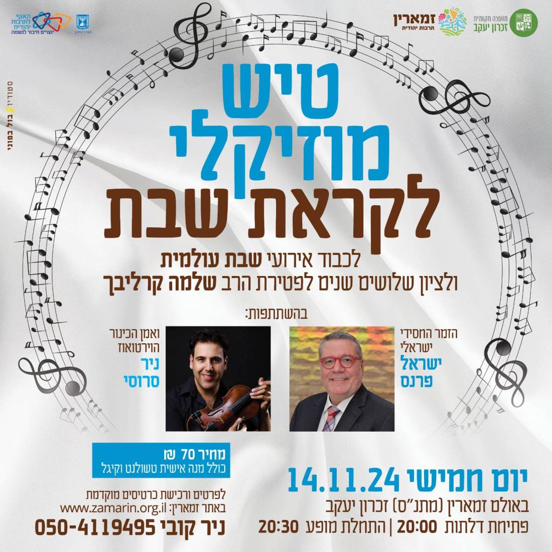 לכבוד אירועי שבת עולמית ולציון שלושים שנה לפטירת הרב שלמה קרליבךטיש מוזיקאלי לקראת שבת בהשתתפותהזמר החסידי ישראלי ישראל פרנסואמן הכינור הוירטואוז ניר סרוסייום חמישי, 14.11.24, אולם זמארין (מתנ"ס) זכרון יעקבפתיחת דלתות וכיבוד 20:00 , התחלת המופע 20:30מחיר כניסה 70 ש"חכולל מנה אישית טשולנט וקיגללהזמנת כרטיסים לחצו https://did.li/VYLaaבברכהניר קובי 050-4119495