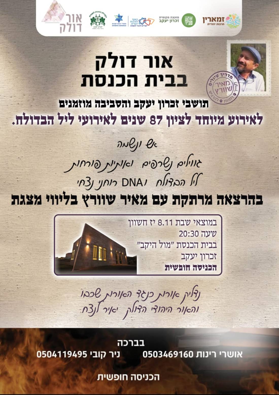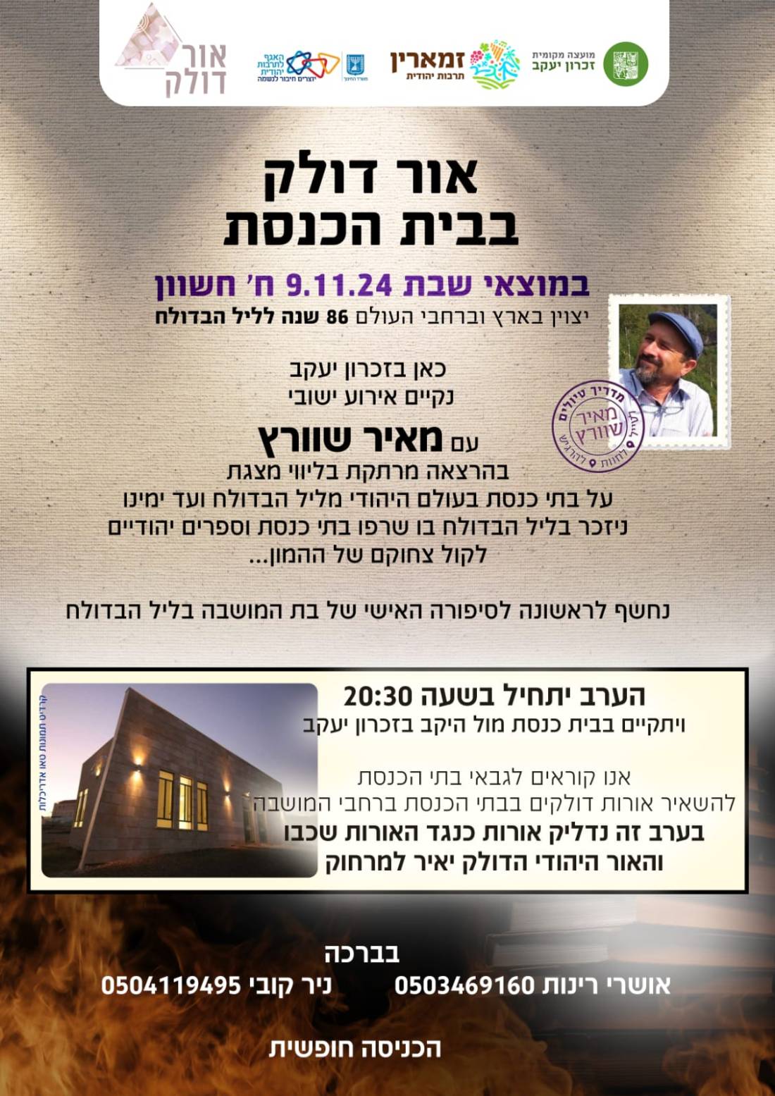 אור דולק בבית הכנסתבמוצאי שבת 9.11.24 ח' חשווןיצוין בארץ וברחבי העולם 86 שנה לליל הבדולחכאן בזכרון יעקבנקיים אירוע ישוביעם מאיר שוורץבהרצאה מרתקת בליווי מצגתעל בתי כנסת בעולם היהודי מליל הבדולח ועד ימינוניזכר בליל הבדולח בו שרפו בתי כנסת וספרים יהודייםלקול צחוקם של ההמון…נחשף לראשונה לסיפורה האישי של בת המושבה בליל הבדולח הערב יתחיל בשעה 20:30ויתקיים … המשך קריאת הפוסט אור דולק בבית הכנסת 86 שנה לליל הבדולח