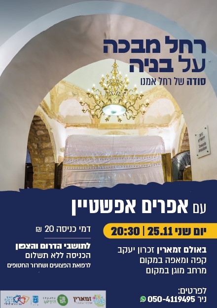 רחל מבכה על בניה סודה של רחל אמנועם אפרים אפשטיין יום שני25.11.24 שעה 20:30 אולם זמארין זכרון יעקבמחיר : 20 ₪כולל קפה ומאפהניר קובי 050-4119495 הכניסה לתושבי הצפון והדרום ללא תשלום *** יש מרחב מוגן במקום