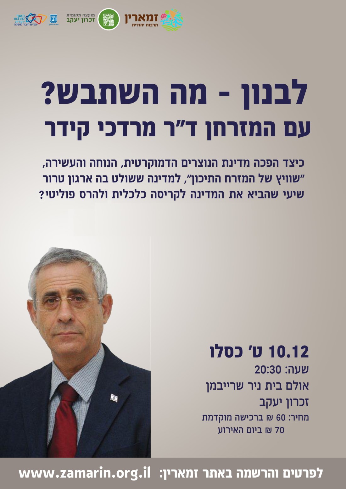 לבנון - מה השתבש?עם המזרחן ד"ר מרדכי קידר כיצד הפכה מדינת הנוצרים הדמוקרטית, הנוחה והעשירה, "שוויץ של המזרח התיכון",למדינה ששולט בה ארגון טרור שיעי שהביא את המדינה לקריסה כלכלית, להרס פוליטי?יום חמישי 10.12 שעה 20:30בית ניר שרייבמן (בית התותחן) זכרון יעקבכניסה: 60 ש"ח ברכישה מוקדמת, 70 ש"ח ביום האירוע להרשמה באתר זמאריןhttps://www.zamarin.org.il/page.php?type=event&id=25974&m=306&ht=#navbar ניר קובי 050-4119495 יש מרחב מוגן … המשך קריאת הפוסט לבנון – מה השתבש?