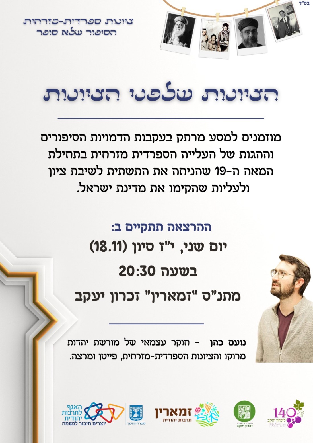 הציונות שלפני הציונותמוזמנים למסע מרתק בעקבות הדמויות הסיפורים וההגהותשל העלייה הספרדית מזרחית בתחילת המאה – 19שהניחה את התשתית לשיבת ציון ולעליות שהקימו את מדינת ישראל.בשילוב מצגת ופיוטים.עם נועם כהן חוקר עצמאי שח מורשת יהדות מרוקו והציונותהספרדית מזרחית, פייטן ומרצה. יום שני 18.11.24שעה 20:30אולם זמארין זכרון יעקבמחיר : 20 ₪כולל קפה ומאפהניר קובי 050-4119495 הכניסה לתושבי … המשך קריאת הפוסט הציונות שלפני הציונות