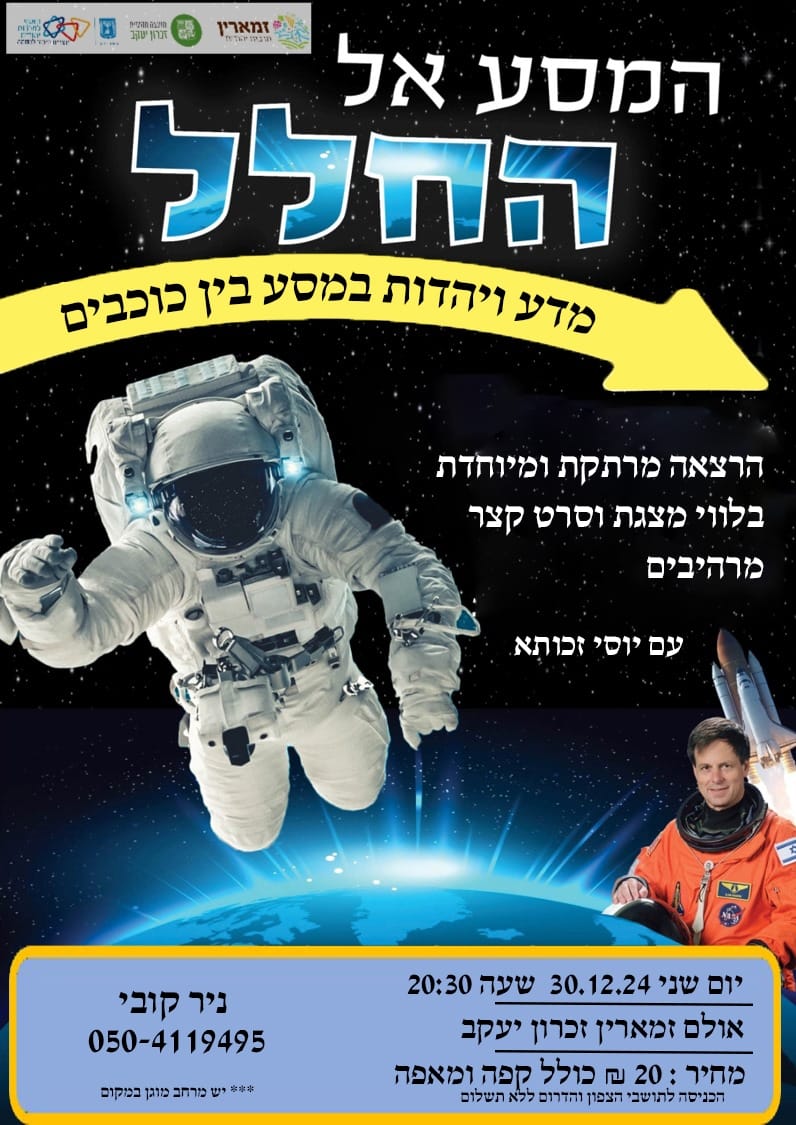 המסע אל החלל מדע ויהדות במסע בין כוכבים הרצאה מרתקת ומיוחדת בלווי מצגת וסרט קצר מרהיבים עם יוסי זכותא יום שני 30.12.24 שעה 20:30 אולם זמארין זכרון יעקבמחיר : 20 ₪כולל קפה ומאפהלרכישת כרטיסים מוקדמתhttps://www.zamarin.org.il/page.php?type=event&id=26067&m=306&ht=#navbarניר קובי 050-4119495 הכניסה לתושבי הצפון והדרום ללא תשלום *** יש מרחב מוגן במקום