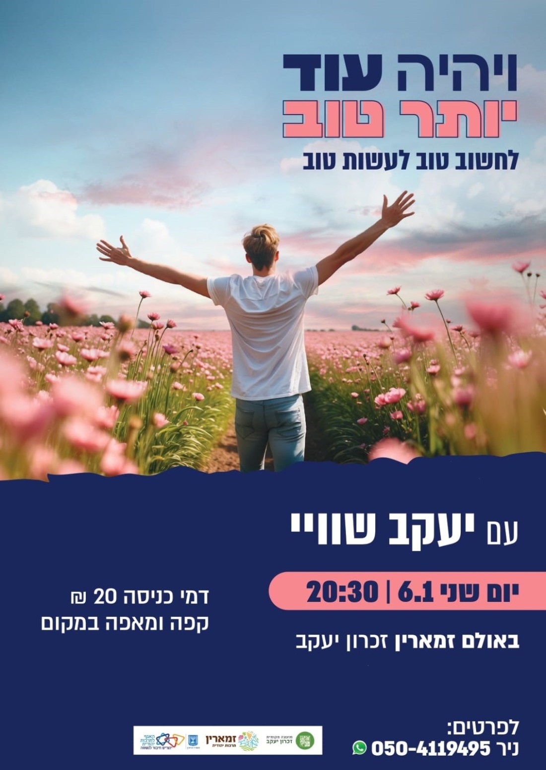 ויהיה עוד יותר טובלחשוב טוב לעשות טובעם יעקב שווייום שני 6.1.25שעה 20:30 אולם זמארין זכרון יעקבמחיר : 20 ₪כולל קפה ומאפהניר קובי 050-4119495