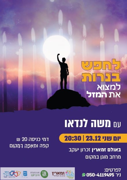 לחפש בנרותלמצוא את המזלעם משה לנדאויום שני 23.12.24שעה 20:30 אולם זמארין זכרון יעקבמחיר : 20 ₪כולל קפה ומאפהניר קובי 050-4119495