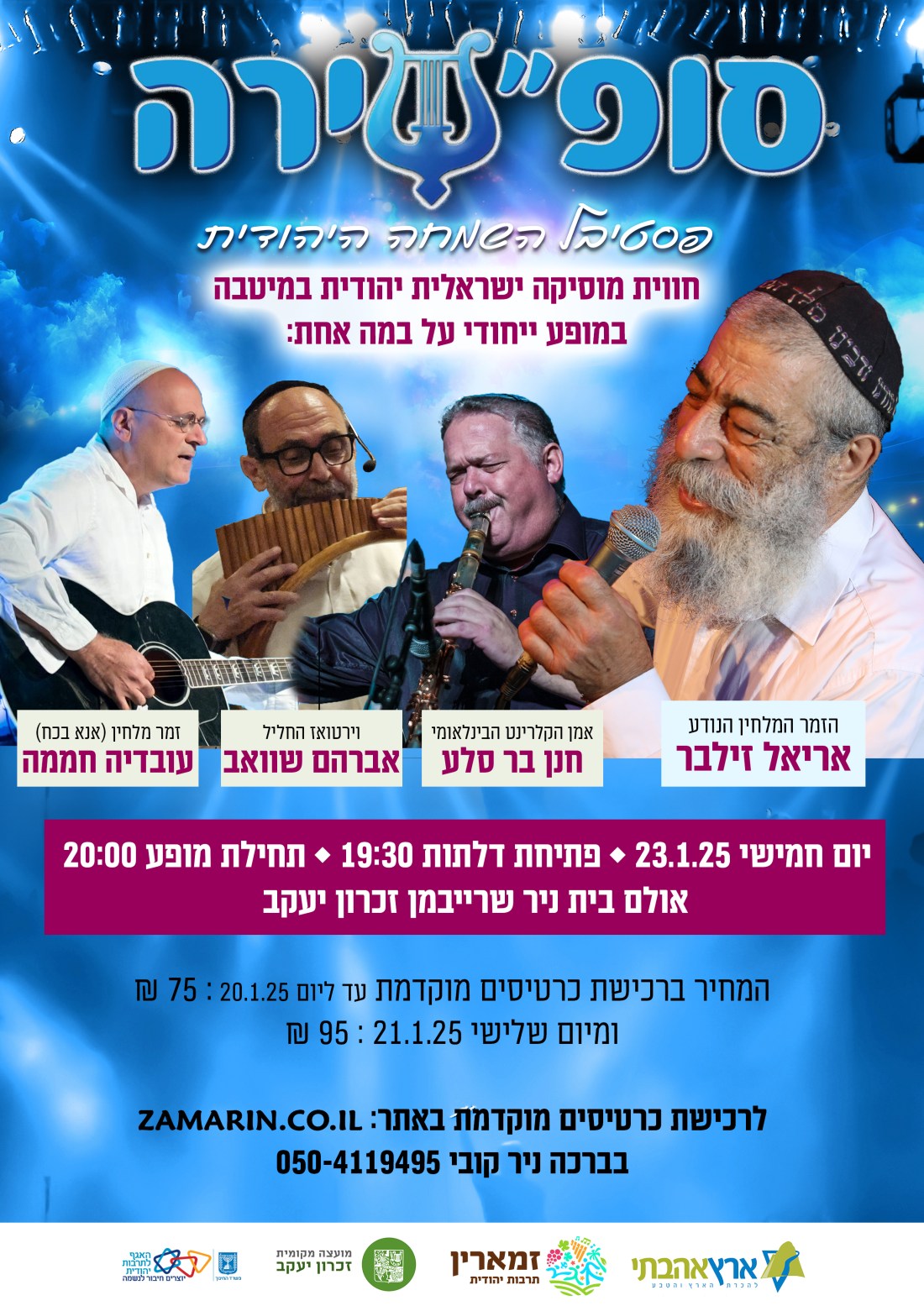 סופשירה - פסטיבל השמחה היהודיתחווית מוסיקה ישראלית יהודית במיטבהבמופע ייחודי על במה אחת:אריאל זילבר – הזמר המלחין הנודעעובדיה חממה – זמר מלחין (אנא בכח)אברהם שוואב – וירטואז החלילחנן בר סלע - אמן הקלרינט הבינלאומייום חמישי 23.1.25פתיחת דלתות 19:30תחילת מופע 20:00אולם בית ניר שרייבמן זכרון יעקבהמחיר ברכישת כרטיסים מוקדמתעד ליום 20.1.25 - 75 ₪.מחיר מיום שלישי … המשך קריאת הפוסט סופשירה – פסטיבל השמחה היהודית