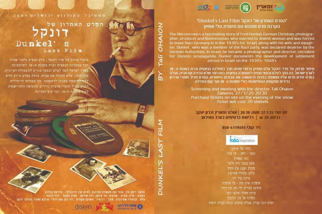 "הסרט האחרון של דונקל Dunkel’s Last Film"הקרנת סרט ומפגש עם היוצרת טלי אוחיון The film uncovers a fascinating story of Fred Dunkel, German Christian,photographer, producer and businessman, who married to Jewish woman and wasforced to leave Nazi Germany in in the 1930's for Israel, along with his wife anddaughter. Dunkel , who was a member … המשך קריאת הפוסט "הסרט האחרון של דונקל Dunkel’s Last Film" – הקרנת סרט ומפגש עם היוצרת טלי אוחיון