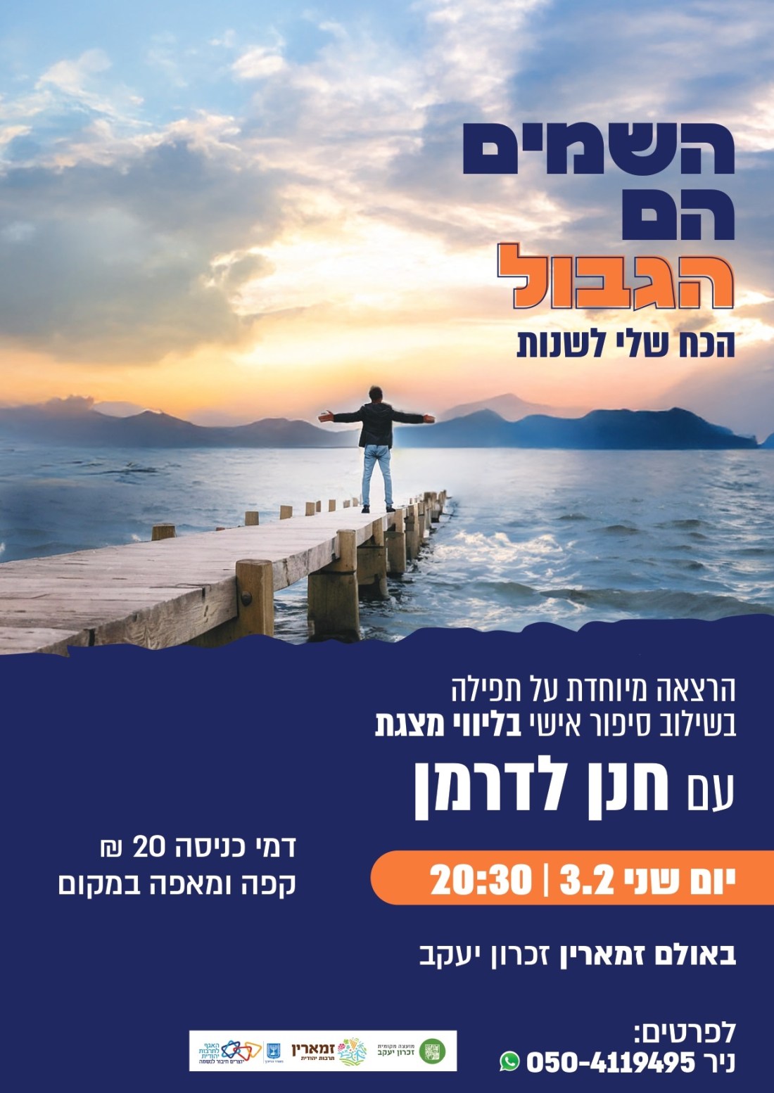 השמים הם לא הגבולהכח שלי לשנותהרצאה מיוחדת על תפילה בשילוב סיפור אישי סרטון מרגש וקטעי משחקעם חנן לדרמן לשעבר שחקן תיאטרון חיפה ופלטפוס. כתב לתוכניות טלוויזיה זהו זההחרצופים ועוד.יום שני 3.2.25שעה 20:30האירוע יתקיים באולם זמארין זכרון יעקבמחיר : 20 ₪בברכהניר קובי 050-4119495