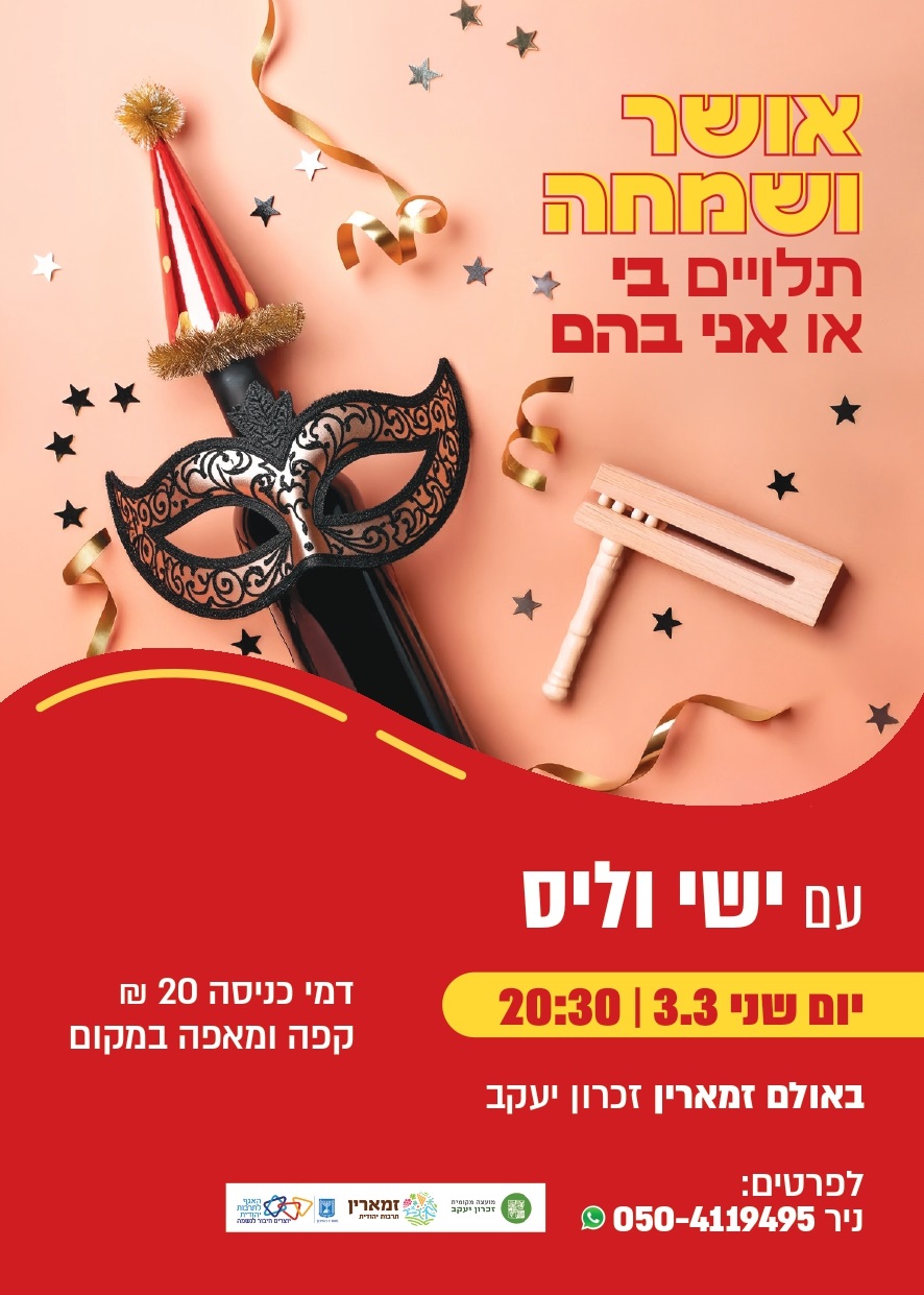 אושר ושמחהתלויים בי או אני בהםעם ישי וליסיום שני 10.3.25שעה 20:30האירוע יתקיים באולם זמארין זכרון יעקבכניסה 20 ₪כולל קפה ומאפהלרכישה מוקדמת באתר זמאריןhttps://www.zamarin.org.il/page.php?type=event&id=27331&m=306&ht=#navbar ניר קובי 050-4119495