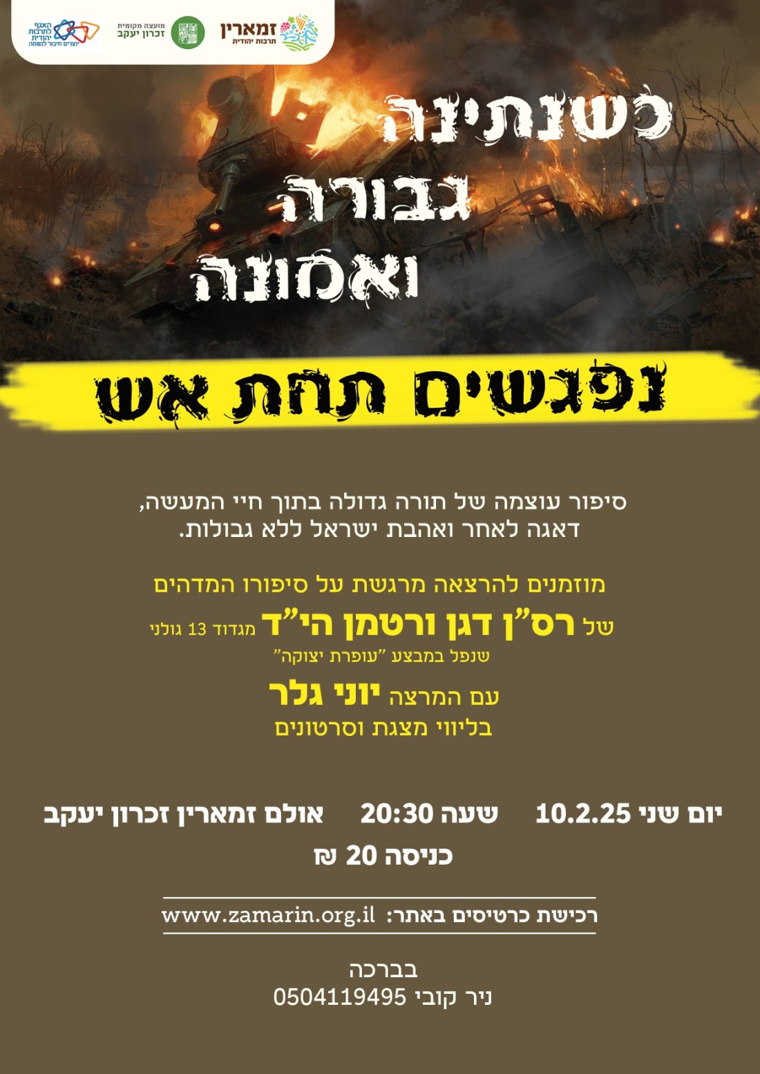 כשנתינה גבורה ואמונה נפגשים תחת אשסיפור עוצמה של תורה גדולה בתוך חיי המעשה,דאגה לאחר ואהבת ישראל ללא גבולות.מוזמנים להרצאה מרגשת על סיפורו המדהים של רס"ן דגן ורטמן מגדוד 13 גולנישנפל במבצע "עופרת יצוקה"עם המרצה יוני גלרבלויי מצגת וסרטוניםיום שני 10.2.25שעה 20:30אולם זמארין זכרון יעקבכניסה 20 ₪לרכישת כרטיסים מוקדמת באתר זמאריןhttps://www.zamarin.org.il/page.php?type=event&id=26990&ht=%D7%A0%D7%AA%D7%99%D7%A0%D7%94%20%D7%92%D7%91%D7%95%D7%A8%D7%94%20%D7%95%D7%90%D7%9E%D7%95%D7%A0%D7%94%20%D7%AA%D7%97%D7%AA%20%D7%90%D7%A9 בברכהניר קובי 0504119495