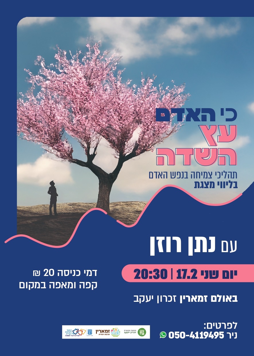 כי האדם עץ השדהתהליכי צמיחה בנפש האדםבילווי מצגתעם נתן רוזןיום שני 17.2.25שעה 20:30אולם זמארין זכרון יעקבכניסה 20 ₪כולל קפה ומאפהלרכישת כרטיסים מוקדמת באתר זמאריןhttps://www.zamarin.org.il/page.php?type=event&id=27014&ht=%D7%9B%D7%99%20%D7%94%D7%90%D7%93%D7%9D%20%D7%A2%D7%A5%20%D7%94%D7%A9%D7%93%D7%94&bc= בברכהניר קובי 0504119495
