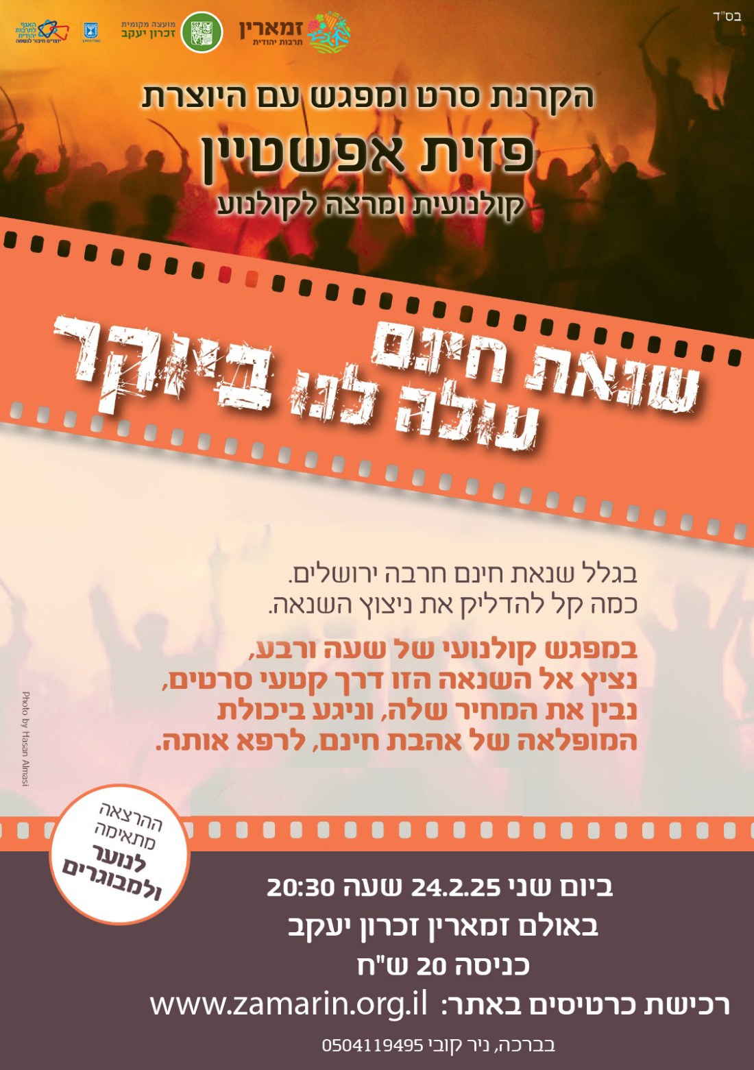 הקרנת סרט ומפגש עם היוצרת פזית אפשטייןשנאת חינם עולה לנו ביוקרבגלל שנאת חינם חרבה ירושלים.כמה קל להדליק את ניצוץ השנאה.במפגש קולנועי של שעה ורבענציץ אל השנאה הזו דרך קטעי סרטים נבין את המחיר שלה,ניגע ביכולת המופלאה של אהבת חינם לרפא אותה.עם פזית אפשטיין קולנועית ומרצה לקולנועיום שני 24.2.25שעה 20:30אולם זמארין זכרון יעקבכניסה 20 ₪ כולל … המשך קריאת הפוסט שנאת חינם עולה לנו ביוקר