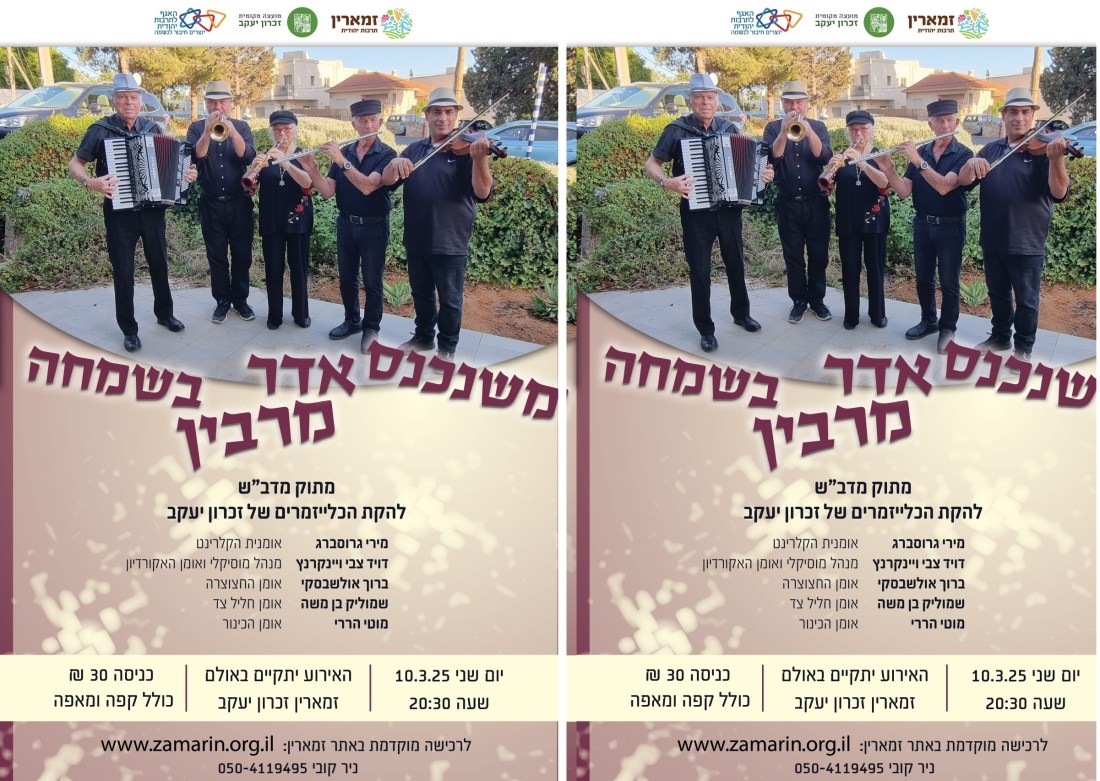 משנכנס אדר מרבין בשמחה מתוק מדב"ש להקת הכלייזמרים של זכרון יעקב מירי גרוסברג – אומנית הקלרינט, דויד צבי ויינקרנץ – מנהל מוסיקלי ואומן האקורדיון, ברוך אולשבסקי – אומן החצוצרה, שמוליק בן משה – אומן חליל צד מוטי הררי אומן הכינור חזן אורח שמואל קרישר יום שני 10.3.25 שעה 20:30 האירוע יתקיים באולם זמארין זכרון יעקב … המשך קריאת הפוסט משנכנס אדר מרבין בשמחה – מתוק מדב"ש להקת הכלייזמרים של זכרון יעקב