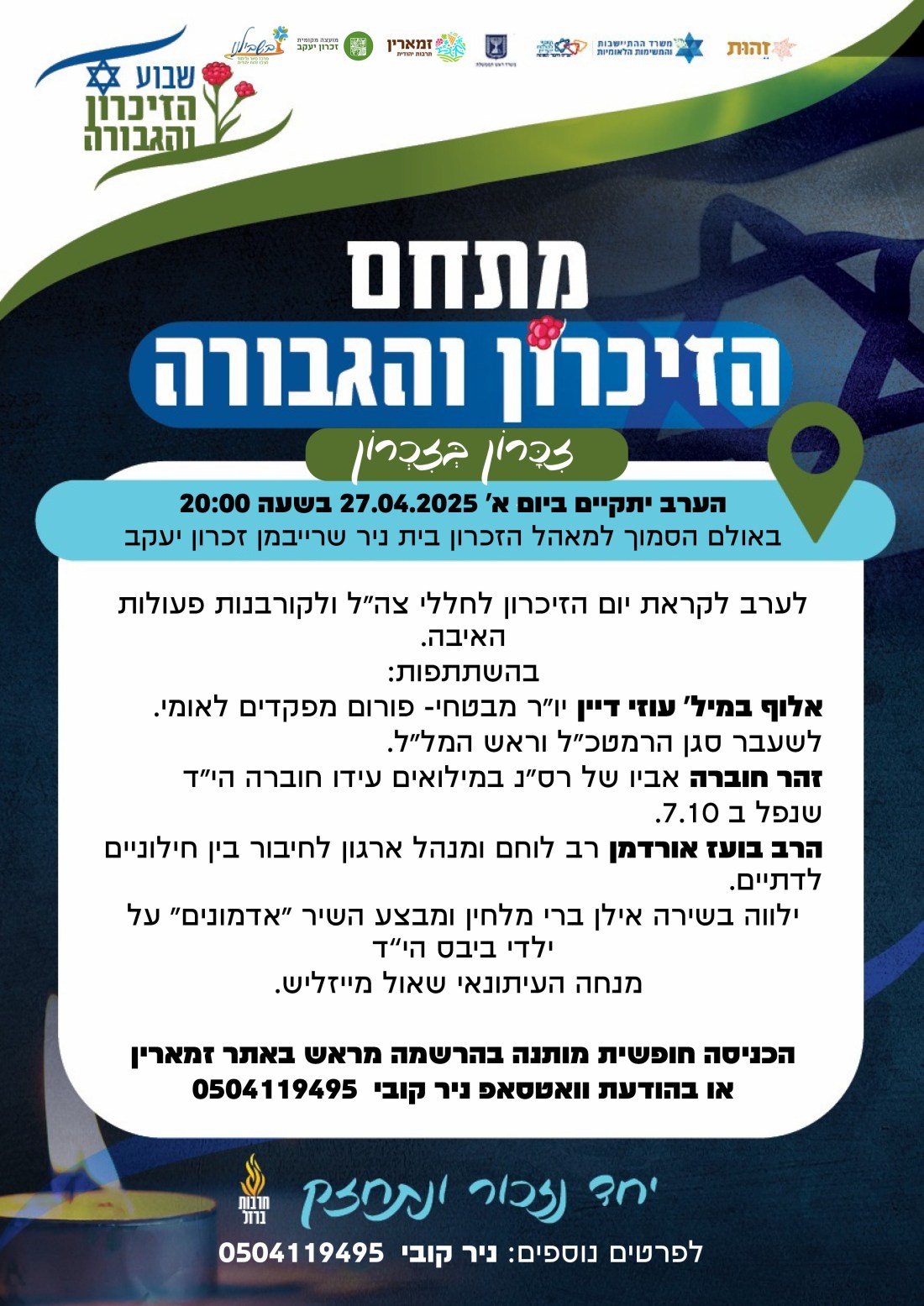 לתת כשאתה אוהבסיפור מופלא ומעורר ההשראה עם חמוטל בן זאב עפרון וכרמל עפרוןעל הדקה ששינתה את חיינו.כרמל עפרון ניצולת מסיבת הנובה בסיפור נס ההצלה. תלווה בקריאת שיריה אמה חמוטל עפרון בן זאב עפרוןעם השירים שנגעו בכולנו ושירים חדשים שנכתבו בעקבות מלחמת חרבות ברזל.יום שני 28.4.25מאהל הזיכרוןשעה 20:30הכניסה חופשית מותנה בהרשמה מראש באתר זמאריןhttps://www.zamarin.org.il/page.php?type=event&id=27796&ht=%D7%96%D7%99%D7%9B%D7%A8%D7%95%D7%9F%20%D7%91%D7%96%D7%9B%D7%A8%D7%95%D7%9F או בהודעת וואטסאפ ניר קובי 0504119495