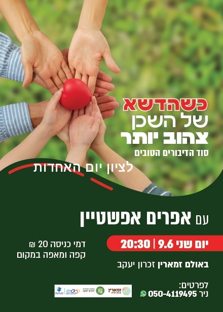 כשהדשא של השכן צהוב יותר –סוד המילים הטובותעם אפרים אפשטייןיום שני 9.6.25שעה 20:30אולם זמארין זכרון יעקב כניסה 20 ש"ח כולל קפה ומאפה לרכישת כרטיסים באתר זמארין https://did.li/bJRrlבברכה ניר קובי 050-4119495