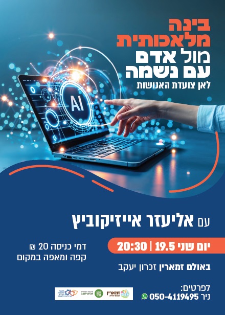 בינה מלאכותית מול אדם עם נשמהלאן צועדת האנושותעם אליעזר אייזיקוביץיום שני 19.5.25שעה 20:30אולם זמארין זכרון יעקב כניסה 20 ₪ כולל קפה ומאפהלרכישת כרטיסים באתר זמארין https://did.li/UnFZH בברכה ניר קובי 050-4119495
