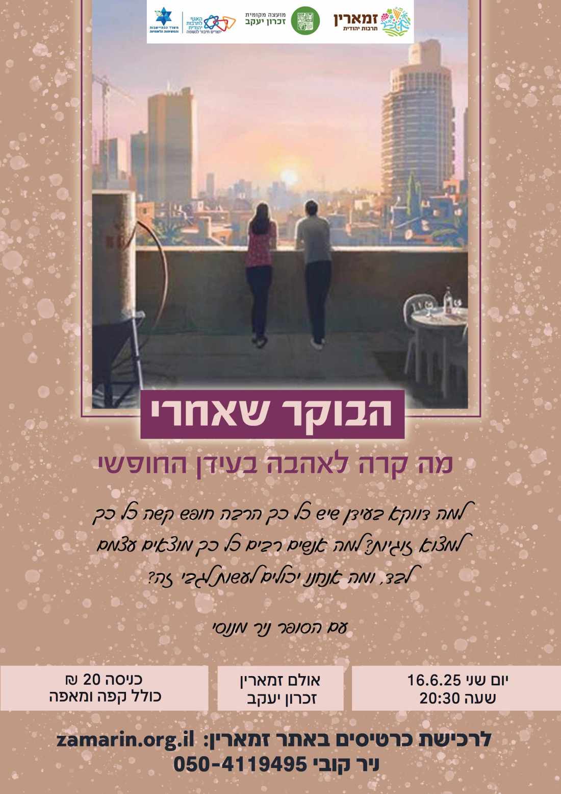 הבוקר שאחרי – מה קרה לאהבה בעידן החופשי?למה דווקא בעידן שיש כל כך הרבה חופש קשה כל כך למצוא זוגיות? למה אנשים רבים כלכך מוצאים עצמם לבד, ומה אנחנו יכולים לעשות לגבי זה? עם הסופר ניר מנוסייום שני 27.10.25שעה 20:30אולם זמארין זכרון יעקב כניסה 20 ₪ כולל קפה ומאפהלרכישת כרטיסים באתר זמארין https://zamarin.smarticket.co.il/show/70בברכה ניר קובי 050-4119495