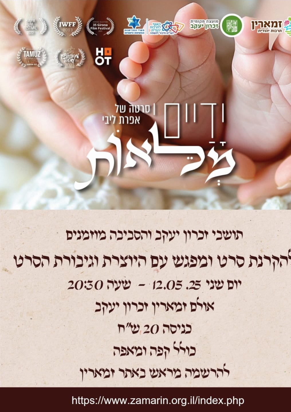 בידיים מלאותתושבי זכרון יעקב והסביבה מוזמנים להקרנת סרט ומפגש עם היוצרת והמפיקה אפרת ליביוגיבורת הסרט.שלוש נשים צעירות, דתיות, מתנחלות אינן מצליחות להמשיך וללדת.מה המחירים שהן ישלמו עבור החלום למשפחה גדולה?סרט עצמתי על נשים שלא מוותרות לעצמן גם כשהכל נראה בלתי אפשרי.יום שני 12.5.25שעה 20:30אולם זמארין זכרון יעקב כניסה 20 ₪ כולל קפה ומאפהלרכישת כרטיסים באתרזמארין https://www.zamarin.org.il/page.php?type=event&id=28043&ht=%D7%94%D7%A7%D7%A8%D7%A0%D7%AA%20%D7%94%D7%A1%D7%A8%D7%98%20%D7%91%D7%99%D7%93%D7%99%D7%99%D7%9D%20%D7%9E%D7%9C%D7%90%D7%95%D7%AAבברכה ניר קובי 050-4119495
