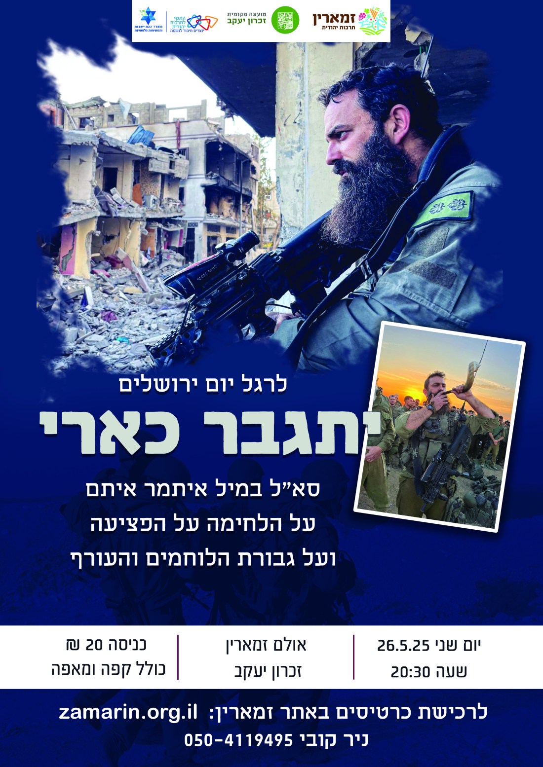 לרגל יום ירושלים יתגבר כארי סא"ל במיל איתמר איתם על הלחימה על הפציעה ועל גבורת הלוחמים והעורף יום שני 26.5.25שעה 20:30אולם זמארין זכרון יעקב כניסה 20 ש"ח כולל קפה ומאפה לרכישת כרטיסים באתר זמארין https://did.li/REQrlבברכה ניר קובי 050-4119495