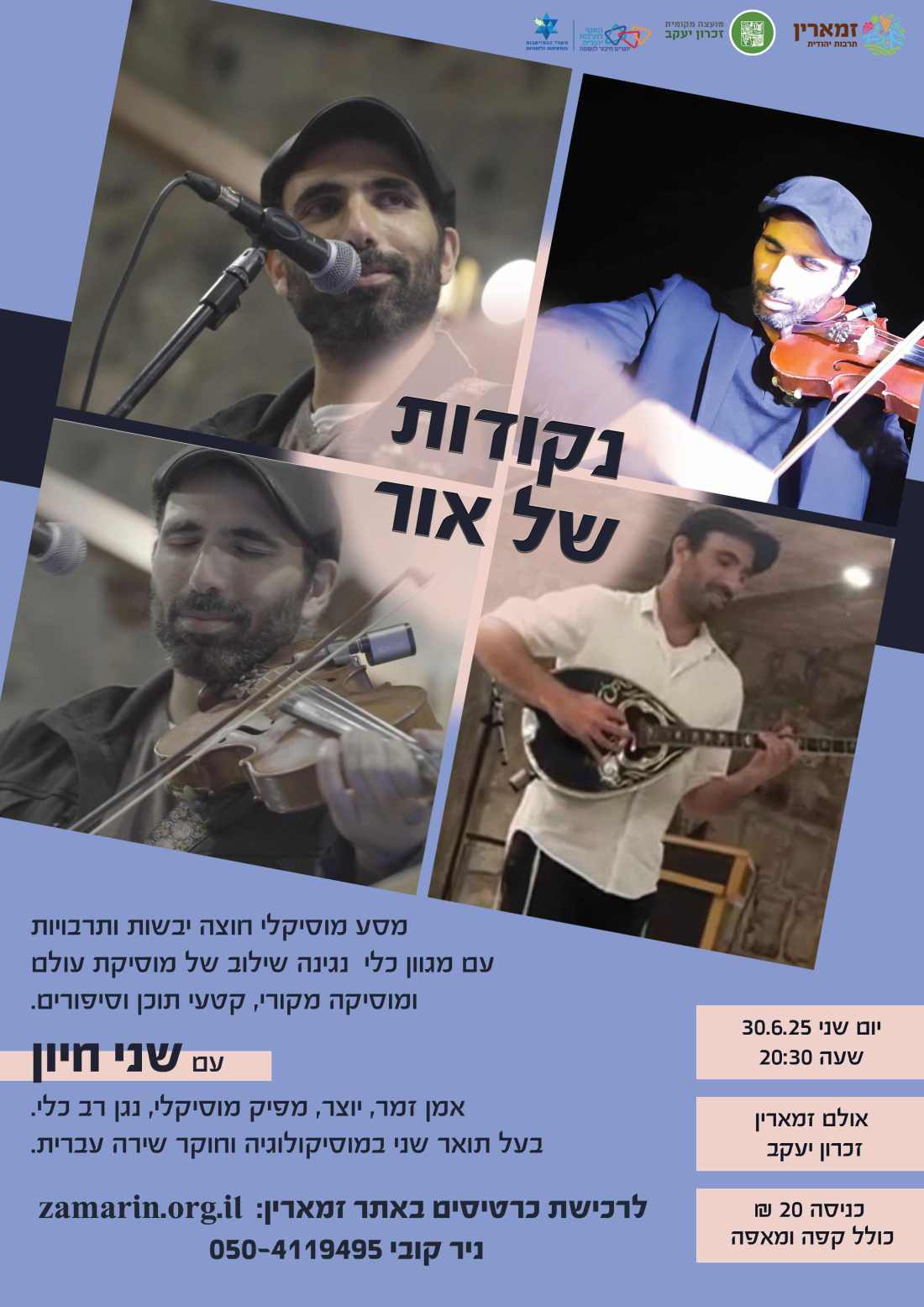 נקודות של אורמסע מוסיקלי חוצה יבשות ותרבויות עם מגוון כלי נגינה שילוב של מוסיקת עולםומוסיקה מקורי קטעי תוכן וסיפורים.עם שני חיון אמן זמר, יוצר, מפיק מוסיקלי, נגן רב כלי. בעל תואר שני במוסיקולוגיה וחוקרשירה עברית.יום שני 30.6.25שעה 20:30אולם זמארין זכרון יעקב כניסה 20 ₪ כולל קפה ומאפהלרכישת כרטיסים באתר זמארין https://did.li/VxpOfבברכה ניר קובי 050-4119495