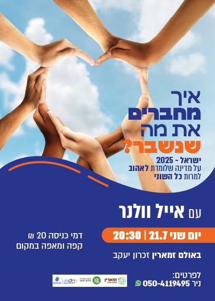 איך מחברים את מה שנשבר?ישראל 2025 – על מדינה שלומדת לאהוב, למרות כל השוניעם אייל ולנריום שני 21.7.25שעה 20:30אולם זמארין זכרון יעקבכניסה 20 ₪ כולל קפה ומאפהלרכישת כרטיסים באתר זמארין https://www.zamarin.org.il/page.php?type=event&id=29007&ht=%D7%90%D7%99%D7%9A%20%D7%9E%D7%97%D7%91%D7%A8%D7%99%D7%9D%20%D7%90%D7%AA%20%D7%9E%D7%94%20%D7%A9%D7%A0%D7%A9%D7%91%D7%A8?&bc=בברכהניר קובי 050-4119495
