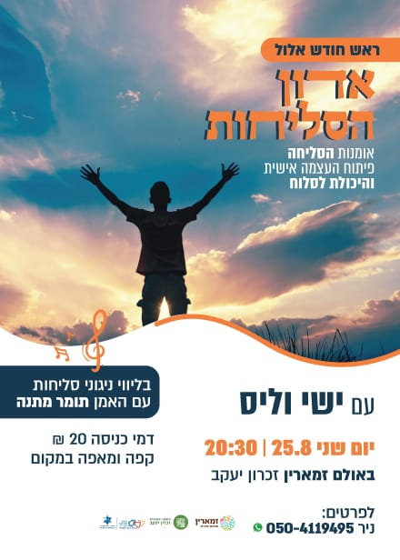 ראש חודש אלולאדון הסליחות – אומנות הסליחה פיתוח העצמה אישית והיכולת לסלוחעם ישי וליסילווה את הערב בפיוטי סליחות וניגונים האמן תומר מתנהיום שני 25.8.25שעה 20:30אולם זמארין זכרון יעקב כניסה 20 ₪ כולל קפה ומאפהלרישום נא שלחו הודעת וואטספלמספר 0504119495 וכתבו מסיבת ראש חודש בברכה ניר קובי