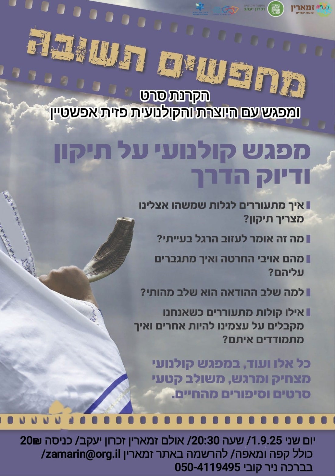 מחפשים תשובההקרנת סרט ומפגש עם היוצרת והקולנועית פזית אפשטייןמפגש קולנועי על תיקון ודיוק הדרךאיך מתעוררים לגלות שמשהו אצלנו צריך תיקוןמהם אויבי החרטה ואיך מגברים עליהםלמה שלב ההודאה הוא שלב מהותיאילו קולות מתעוררים אצלנו כשאנחנו מקבלים על עצמנו להיות אחריםכל אלו ועוד במפגש קולנועי מצחיק ומרגש משולב קטעי סרטים וסיפורים מהחייםיום שני 1.9.25שעה 20:30אולם זמארין זכרון … המשך קריאת הפוסט מחפשים תשובההקרנת סרט ומפגש עם היוצרת והקולנועית פזית אפשטיין