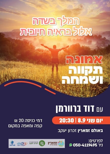 המלך בשדה אלול בראיה חיוביתאמונה תקווה ושמחהעם דוד ברוורמןיום שני 8.9.25שעה 20:30אולם זמארין זכרון יעקבכניסה 20 ₪ כולל קפה ומאפהלהרשמה מוקדמת באתר זמארין https://zamarin.smarticket.co.il/show/52בברכהניר קובי 050-4119495
