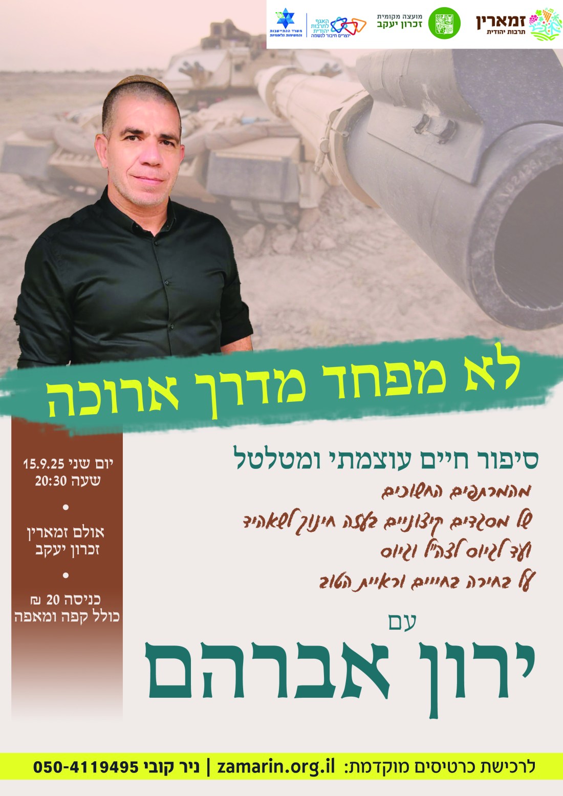 לא מפחד מדרך ארוכהסיפור חיים עוצמתי ומטלטלמהמרתפים החשוכים של מסגדים קיצוניים בעזה חינוך לשאהידועד לגיוס לצה"ל וגיוס . על בחירה בחייים וראיית הטוב.עם ירון אברהםיום שני 15.9.25שעה 20:30אולם זמארין זכרון יעקבכניסה 20 ₪ כולל קפה ומאפהלרכישת כרטיסים מוקדמת https://zamarin.smarticket.co.il/show/22בברכהניר קובי 050-4119495