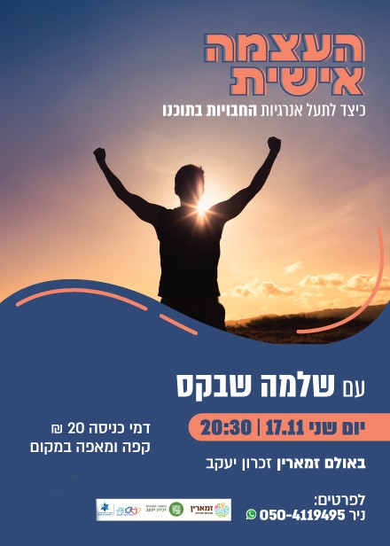 https://www.facebook.com/share/p/1L3kNg26Bs/ העצמה אישיתכיצד לתעל אנרגיות החבויות בתוכנועם שלמה שבקסיום שני 17.11.25שעה 20:30אולם זמארין זכרון יעקבכניסה 20 ₪ כולל קפה ומאפההרשמה מוקדמתhttps://zamarin.smarticket.co.il/show/101בברכהניר קובי 050-4119495