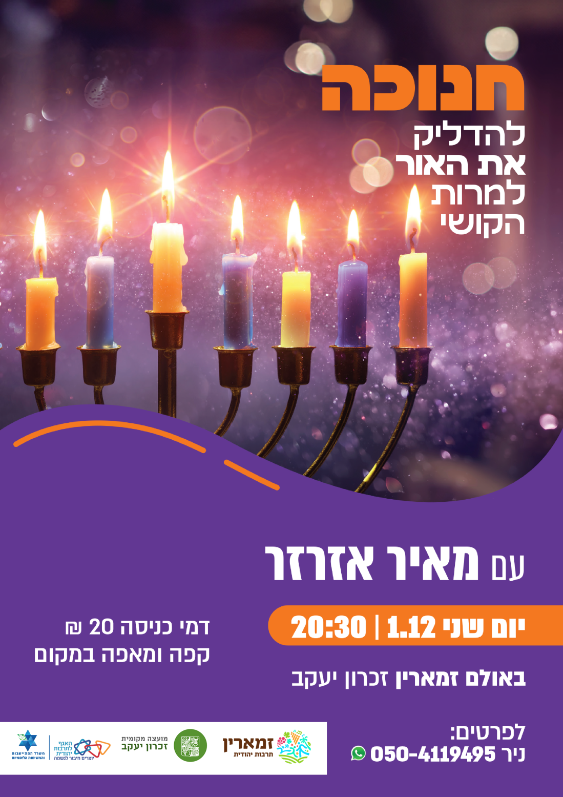 חנוכה- להדליק את האור למרות הקושיעם מאיר אזרזאר רב הקהילה היהודית בהונג קונגיום שני 1.12.25שעה 20:30אולם זמארין זכרון יעקבכניסה 20 ₪ כולל קפה ומאפהלרכישת כרטיסים מוקדמת באתר זמאריןhttps://zamarin.smarticket.co.il/show/109בברכהניר קובי 050-4119495