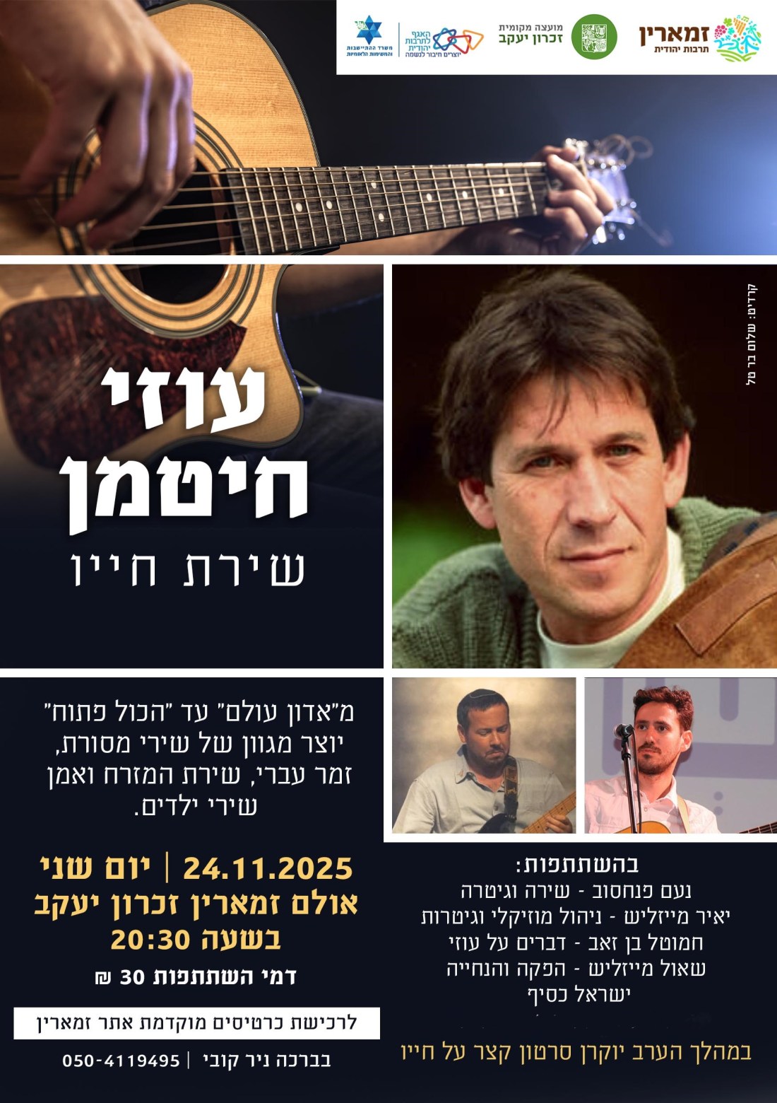 עוזי חיטמן - שירת חייו מ"אדון עולם" עד "הכול פתוח" יוצר מגוון של שירי מסורת, זמר עברי, שירת המזרח ואמן שלשירי ילדים.בהשתתפות:נעם פנחסוב – שירה וגיטרהיאיר מייזליש – ניהול מוסיקלי וגיטרותחמוטל בן זאב – דברים על עוזיגל גילברשטיין מוסיקאי מורה למוסיקה ומספר סיפוריםבמהלך הערב יוקרן סרטון קצר על חייושאול מייזליש – הפקה והנחייההערב יתקיים ב-24.11.2025 אולם … המשך קריאת הפוסט עוזי חיטמן – שירת חייו