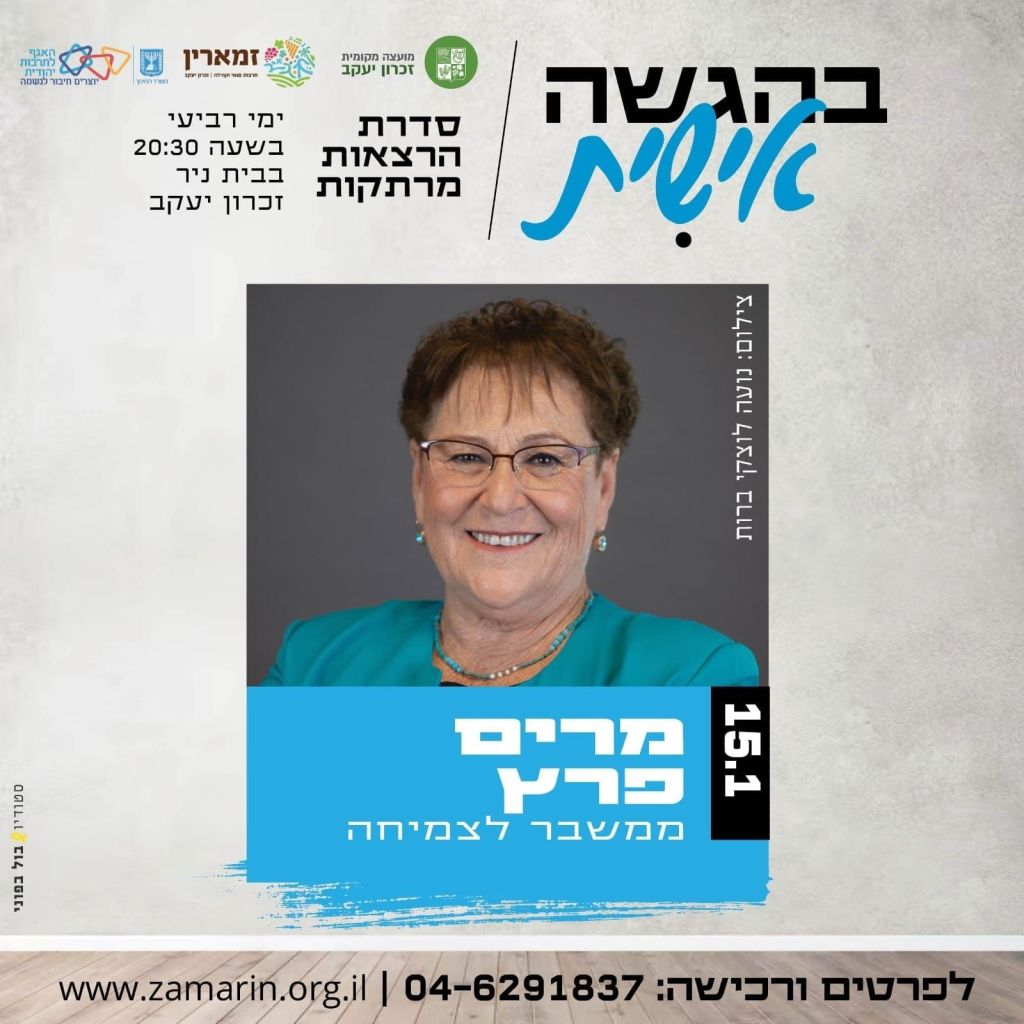 מרים פרץ – ממשבר לצמיחההרצאתה של כלת פרס ישראל, על מנהיגות, קבלת החלטות ואחריות אישית,העצמה נשית, תפיסות על משמעות החיים וראיית הטוב בחיים – דרך סיפורה האישי.יום רביעי, 15.120:30,בבית ניר שרייבמן זכרון יעקבלפרטים וכרטיסיםhttps://bit.ly/4efA39bזמארין – העמותה לתרבות פנאי וקהילה בזכרון יעקבאו בטלפון 04-6291837