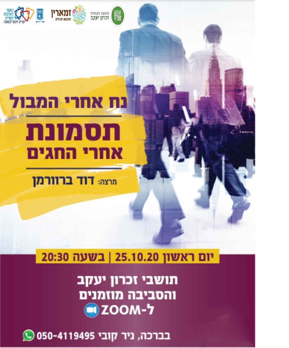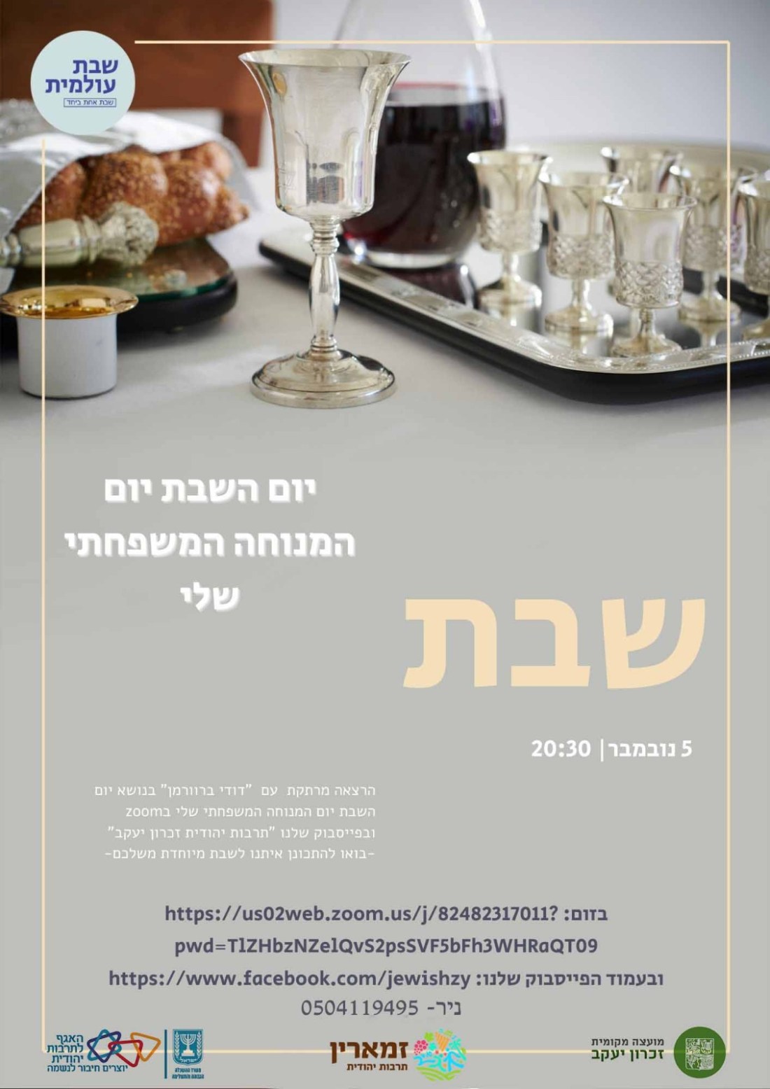 תרבות יהודית זכרון יעקב מציינת שבת עולמית ומזמינה אתכם להרצאתZOOM יום השבת יום המנוחה המשפחתי שלי עם דודי ברוורמן יום חמישי 5.11.20 שעה 20:30 קישור ל - ZOOM https://us02web.zoom.us/j/82482317011?pwd=TlZHbzNZelQvS2psSVF5bFh3WHRaQT09 ההרצאה תשודר גם בלייב בדף הפייסבוק שלנו https://goo.gl/Hv7KSZ ניר קובי 050-4119495