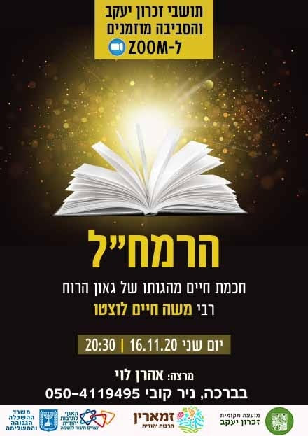תושבי זכרון יעקב והסביבה מוזמנים להרצאת ZOOM הרמח"ל חכמת חיים מהגותו של של גאון הרוח רבי משה חיים לוצטו עם אהרון לוי יום שני 16.11.20 שעה 20:30 קישור להתחברות ל- ZOOM https://us02web.zoom.us/j/86250453627?pwd=WUp2ejJHMGFzaFNwak8zalE2TWVNUT09 בברכה ניר קובי 050-4119495