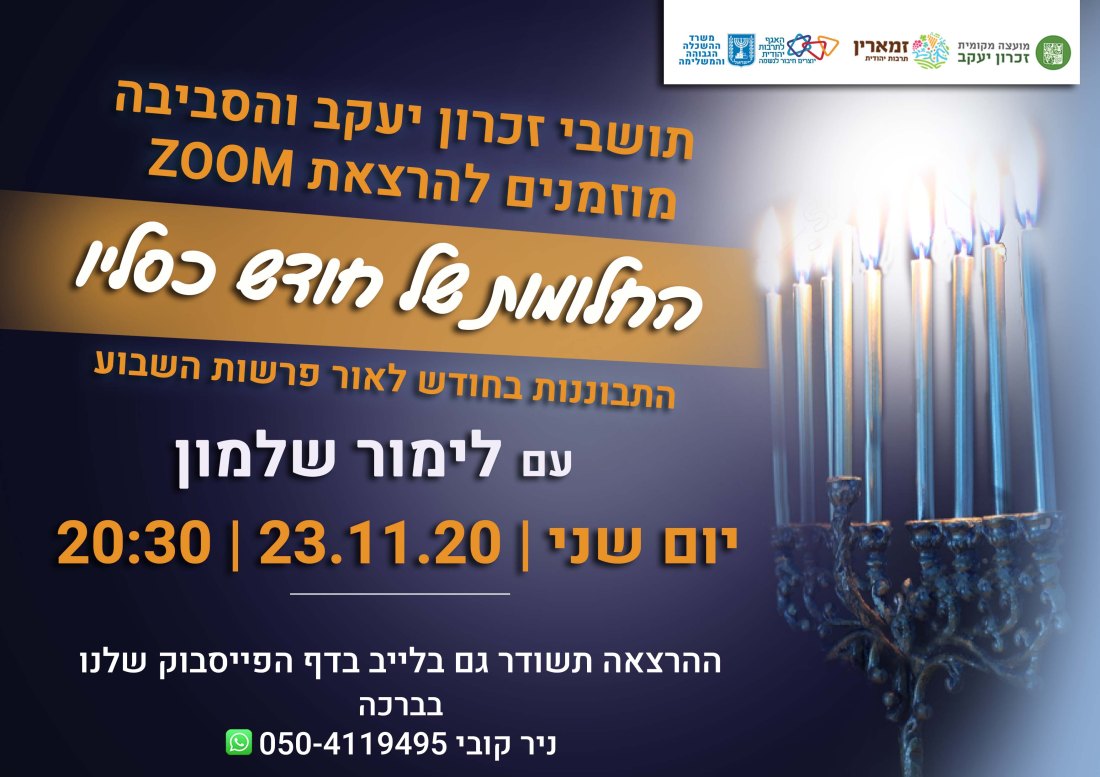 תושבי זכרון יעקב והסביבה מוזמנים להרצאת ZOOMאילו הובסו המכביםהצד הנסתר של סיפור חנוכהעם אליעזר אייזיקוביץיום שני30.11.20שעה 20:30קישור להתחברות ל- ZOOM https://us02web.zoom.us/j/81133652026?pwd=ek1TM0xwQXVoamFoVHBjY1hPZkhQdz09ההרצאה תשודר ב- LIVE בדף הפייסבוק של תרבות יהודית https://goo.gl/Hv7KSZבברכהניר קובי 050-4119495