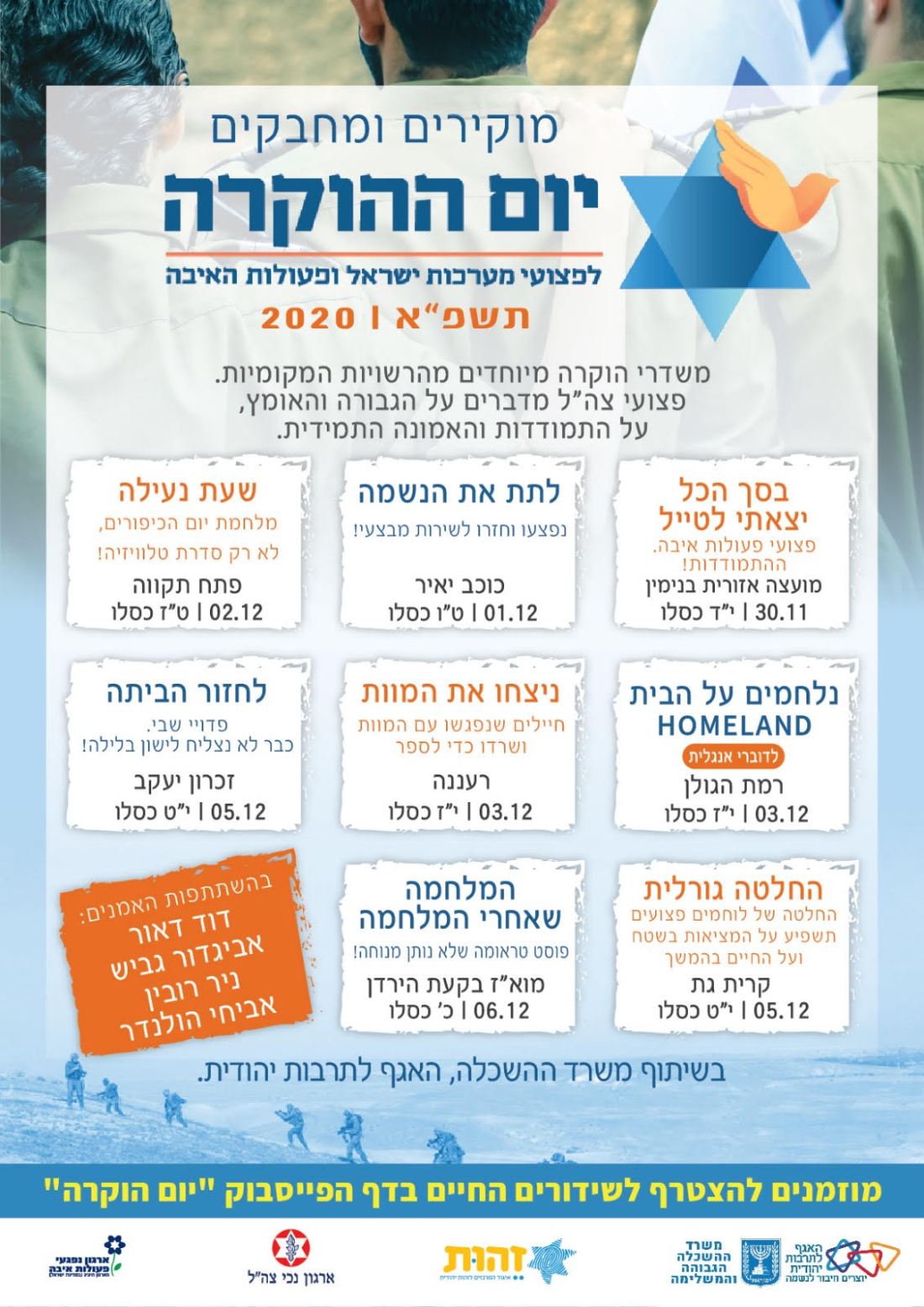 מוקירים ומחבקים יום ההוקרה לפצועי מערכות ישראל ופעולות האיבה לחזור הביתה פדויי שבי, כבר לא נצליח לחזור הביתה פצועי צה"ל מדברים על הגבורה והאומץ, על ההתמודדות והאמונה התמידיתברכות: מר זיו דשא ראש המועצה, ניר קובי מנהל מחלקת תרבות יהודית יוסי גרוף וגידי פרנהיט. מנחה: מיכה שוורץ בהשתתפות האמנים: דוד דאור ואביגדור גביש מוצאי שבת 5.12 … המשך קריאת הפוסט יום ההוקרה לפצועי מערכות ישראל ופעולות האיבה