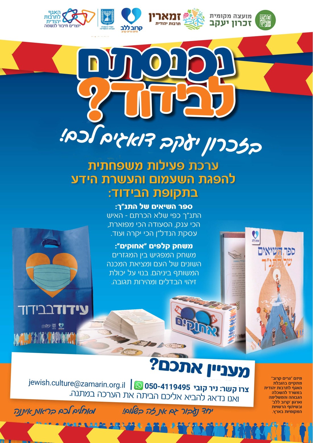 בבידוד ? יש לכם חבר שכן או בן משפחה בבידוד? מכירים משפחה מרובת ילדים או אזרחים ותיקים שזקוקים לעידוד? *"תרבות יהודית - זכרון יעקב" דואגים לכם לערכת פעילות משפחתית להפגת השעמום והעשרת הידע* מעניין אתכם? צרו קשר בוואטסאפ או במייל : ניר קובי 050-4119495 jewish.culture@zamarin.org.il אם אתם מעוניינים לאסוף עבורם את הערכה נשמח ואם תרצו שנשלח … המשך קריאת הפוסט בבידוד ? יש לכם חבר שכן או בן משפחה בבידוד?