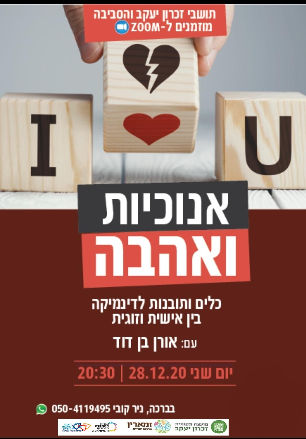 כלים ותובנות לדינמיקה בין אישית וזוגית תושבי זכרון יעקב והסביבה מוזמנים להרצאתZOOM אגואיזם ואהבה כלים ותובנות לדינמיקה בין אישית וזוגית עם אורן בן דוד יום שני 28.12.20 שעה 20:30 קישור להתחברות ל- ZOOM https://us02web.zoom.us/j/88471411185?pwd=SVpmTHAyUVREZy9zeXBBRGF2NE5OQT09 בברכה ניר קובי 050-4119495